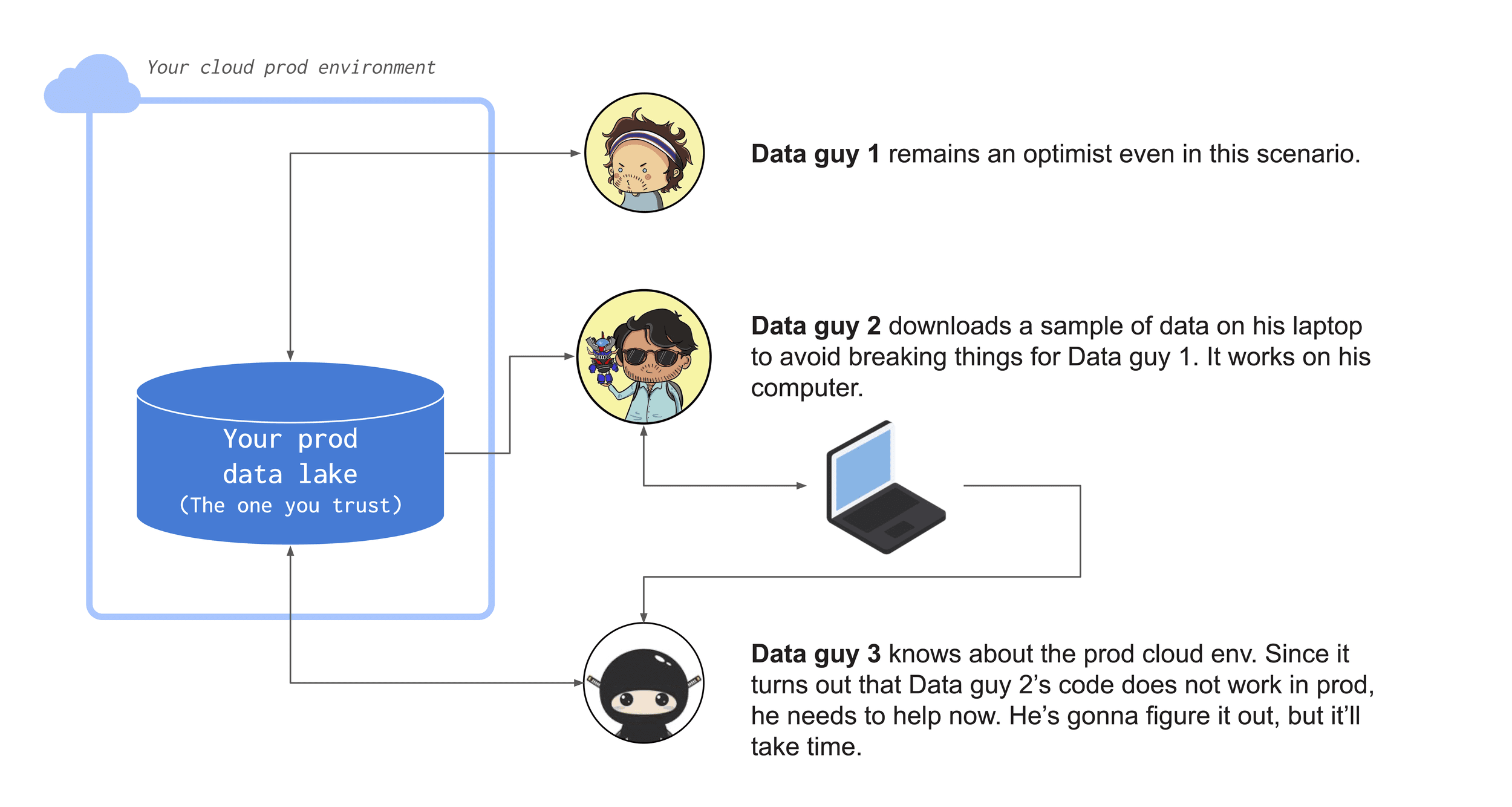 Because using production data is often a necessity for developers, we would ideally want data platforms to offer a developer experience that facilitates working on real data while ensuring solid guardrails at the same time.